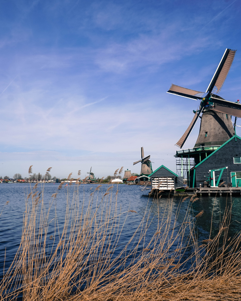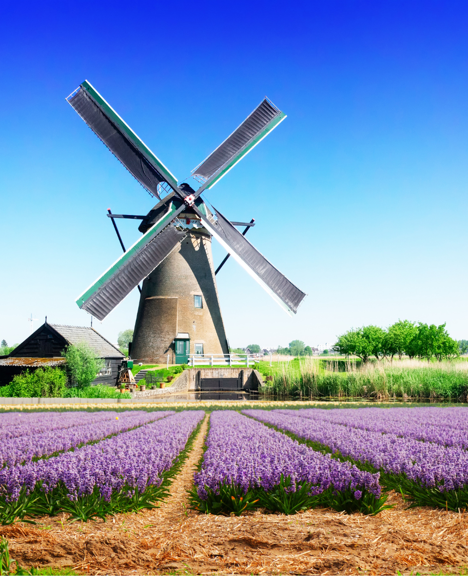 Países Baixos: Amsterdam com seus museus e canais, os espetaculares jardins de tulipas de Keukenhof, a sofisticada Haia, a charmosa Delf, a moderna Rotterdam e os icônicos moinhos de Kinderdijk.